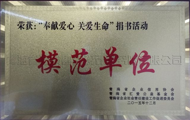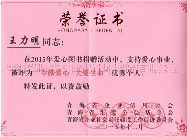表彰大會上,為第三批“國家信用等級”企業(yè),“我誠信我光彩”主題征文活動獲獎作者, 26家“青海誠信經(jīng)營示范單位”,18家“星級信用商戶”,18家“奉獻愛心、關(guān)愛生命”圖書捐贈“突出貢獻單位”,19家等頒發(fā)了牌匾、證書及獎品。我公司獲“奉獻愛心、關(guān)愛生命”圖書捐贈模范單位;公司董事長王力明獲“奉獻愛心、關(guān)愛生命”圖書捐贈優(yōu)秀個人;賀海濤同志獲“我誠信我光彩”主題征文活動“優(yōu)秀征文獎”。