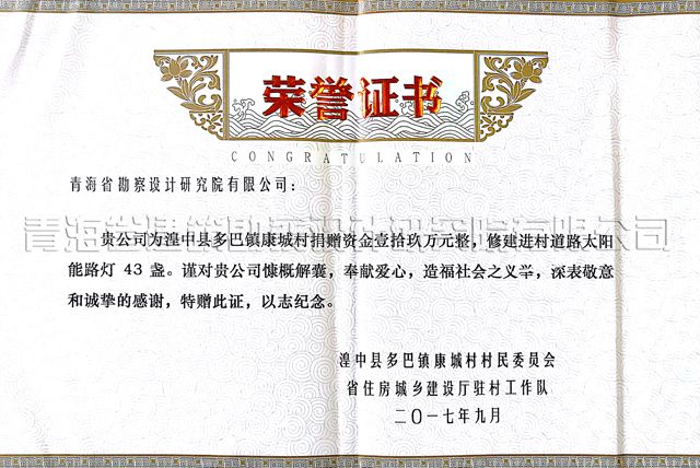 2017年10月26日,湟中縣多巴鎮(zhèn)康城村村民委員會頒給公司一塊獎牌和一本榮譽證書。獎牌上“情系鄉(xiāng)村真奉獻,村莊舊貌換新顏”的十四個紅紅的大字顯得十分醒目?!百F公司為湟中縣多巴鎮(zhèn)康城村捐贈資金壹拾玖萬元整,修建進村道路太陽能路燈43盞。謹對貴公司慷慨解囊、奉獻愛心,造福社會之義舉,深表敬意和誠摯的感謝。特贈此證,以志紀念”,榮譽證書上暖暖的一番話,記錄了公司對聯(lián)點幫扶村——康城村的真幫扶和真愛心,也表達了康城村村民對公司的一片感恩之情。
