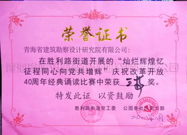 8月2日,西寧市城西區(qū)勝利路黨工委和公園巷社區(qū)黨支部在轄區(qū)聯(lián)合舉辦了“燦爛輝煌憶征程,同心向黨共曾輝”慶祝改革開(kāi)放40周年經(jīng)典誦讀比賽,我公司設(shè)計(jì)一所張麗潔代表單位參賽,她朗誦的詩(shī)歌——《憶黨史、頌黨情、跟黨走》,在本次誦讀比賽中為單位贏得誦讀比賽三等獎(jiǎng)。特向參賽者表示祝賀。